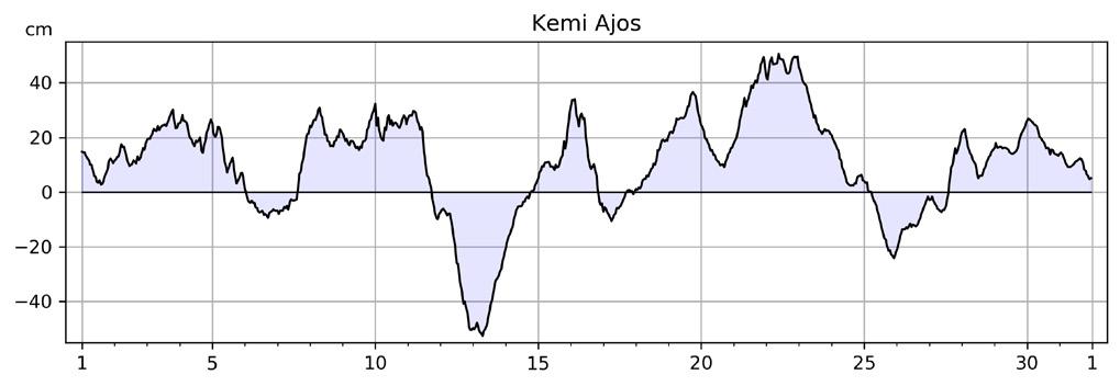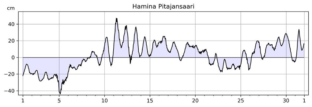 Meriveden korkeus suhteessa teoreettiseen keskivedenkorkeuteen lokakuussa 2025. Kuvaajissa on esitetty mareografeilla tunneittain mitattu keskimääräinen vedenkorkeus.