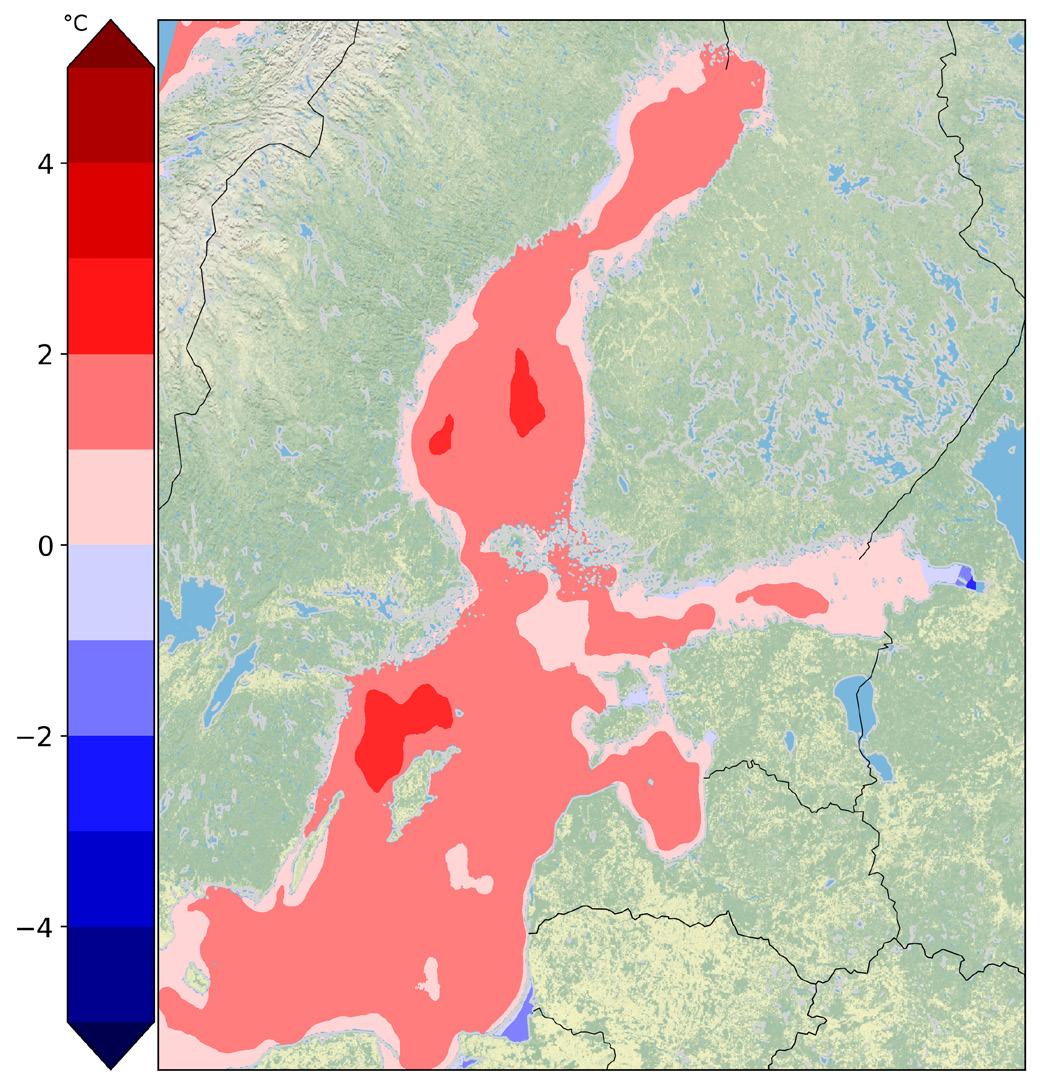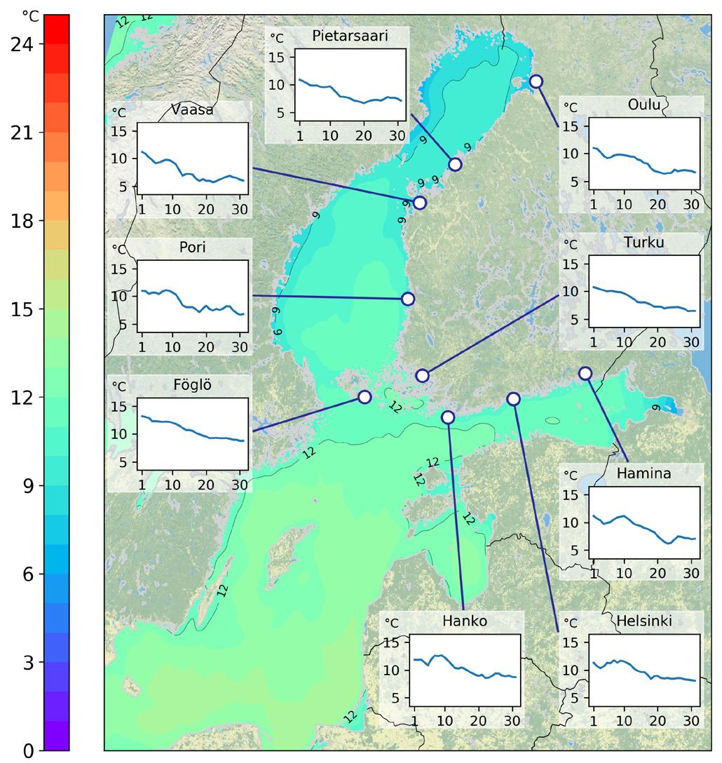 Ilmatieteen laitos on tuottanut Itämeren pintalämpötilaanalyysit Marine Copernicuksen aineistosta. Keskiarvot on laskettu päivittäisistä arvoista. Asemakohtaiset kuvaajat perustuvat Ilmatieteen laitoksen mareografihavaintoihin.