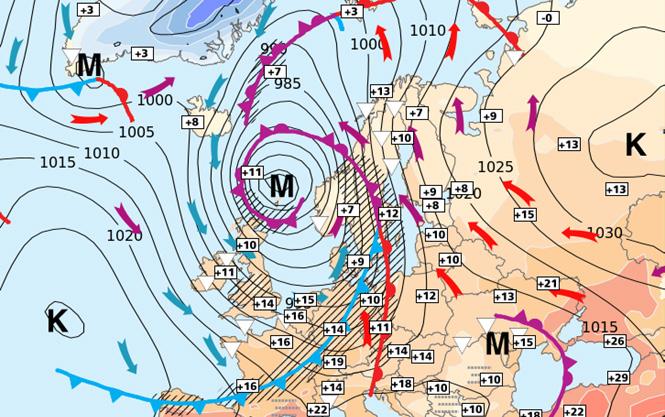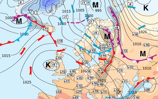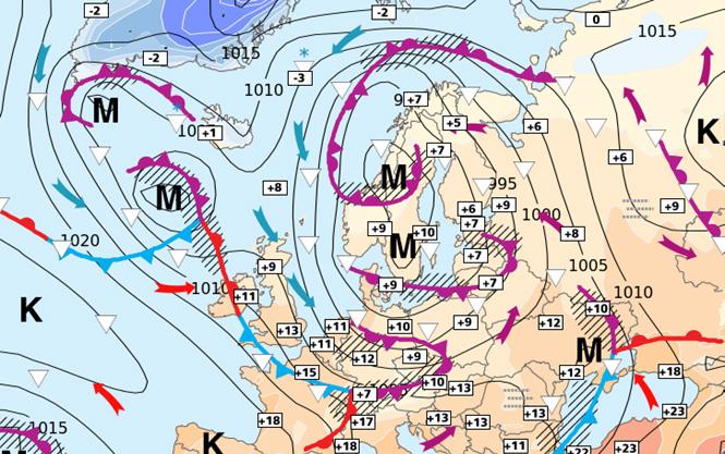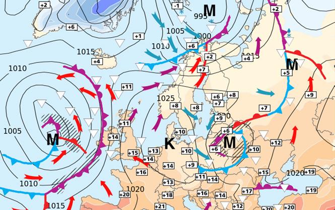 Kuvat ovat Ilmatieteen laitoksen säätilanneanalyysejä ajanhetkiltä 12 UTC eli klo 14 Suomen normaaliaikaa.