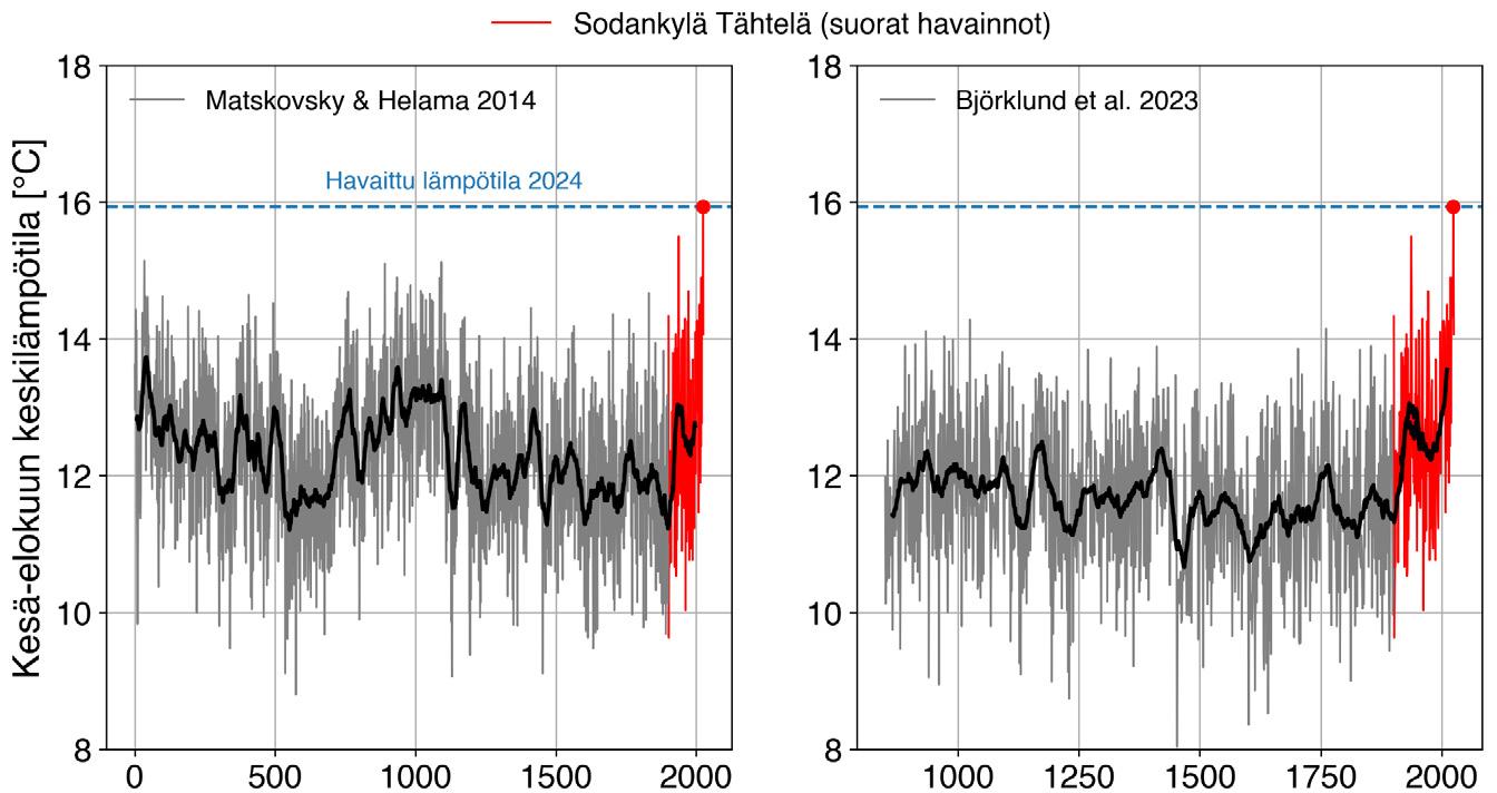 Halusimme tietää, kuinka poikkeuksellinen kesä 2024 oli vuosituhansien aikaskaalalla, joten käytetyt rekonstruktiot skaalattiin Sodankylän Tähtelän havaintojen suhteen. Ensimmäinen rekonstruktio kattaa vuodet 8 eKr – 2010 jKr ja toinen vuodet 850–2019 jKr (kuva 1). Näistä vuosilustoaineistoista pidempi, yli 2000 vuo