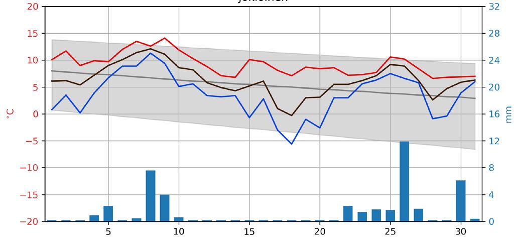 reilut 10 astetta. Kuukauden alimmaksi lämpötilaksi jäi tällöin Enontekiön lentoasemalla ja Muonion Oustajärvellä mitattu 13,4 °C.