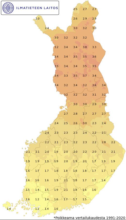 Lokakuun keskilämpötila oli 1–4 astetta jakson 1991–2020 keskiarvoa korkeampi.
