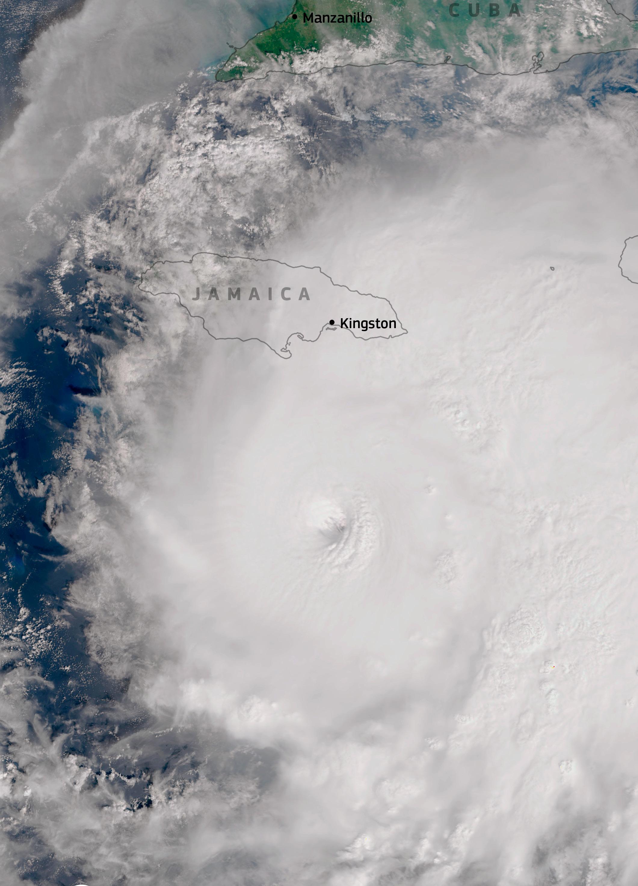 Yksi Euroopan Unionin Copernicus-ohjelman Sentinel-2 satelliiteista kuvasi hurrikaani Melissan silmän 28. lokakuuta, vain muutamia tunteja ennen kuin hurrikaani iskeytyi Jamaikan etelärannikolle. Melissa oli Jamaikan historian ensimmäinen korkeimman 5-kategorian hurrikaani Saffirin-Simpsonin viisiportaisella hurrikaanien luokitteluasteikolla.