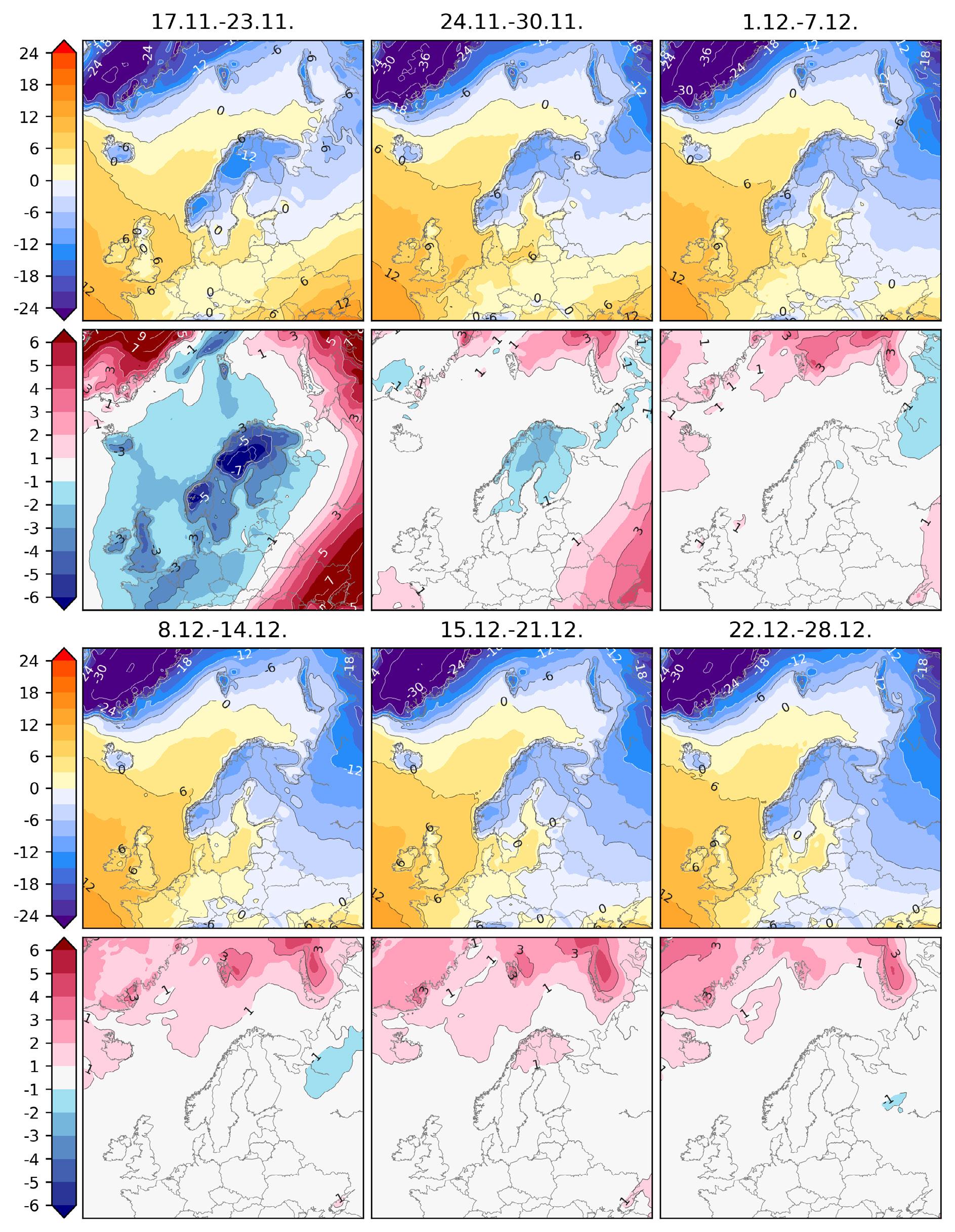 Ennustettu keskimääräinen ilman lämpötila 2 metrin korkeudella (°C) seuraavien kuuden viikon aikana (ylemmät kuvat) ja ennustetun lämpötilan poikkeama (°C) edellisten 20 vuoden keskiarvosta (alemmat kuvat).