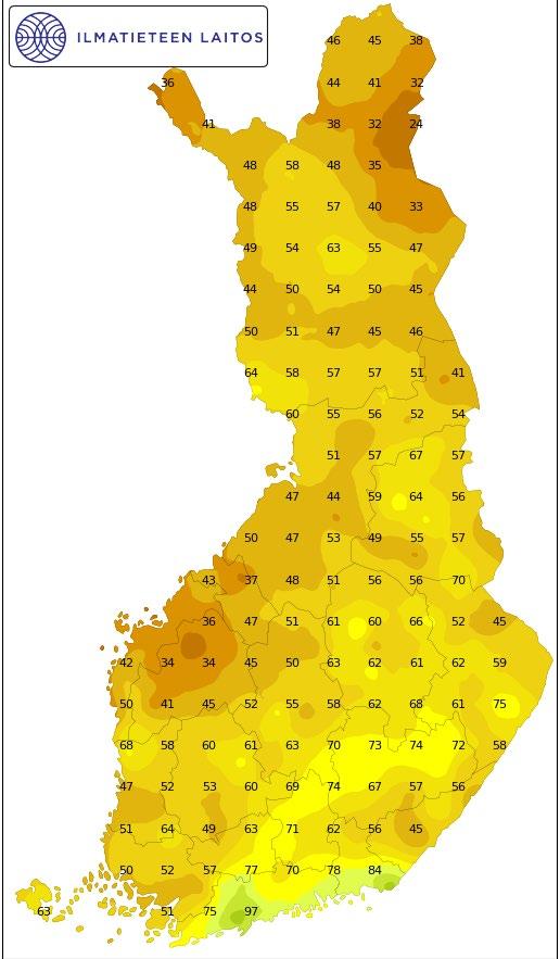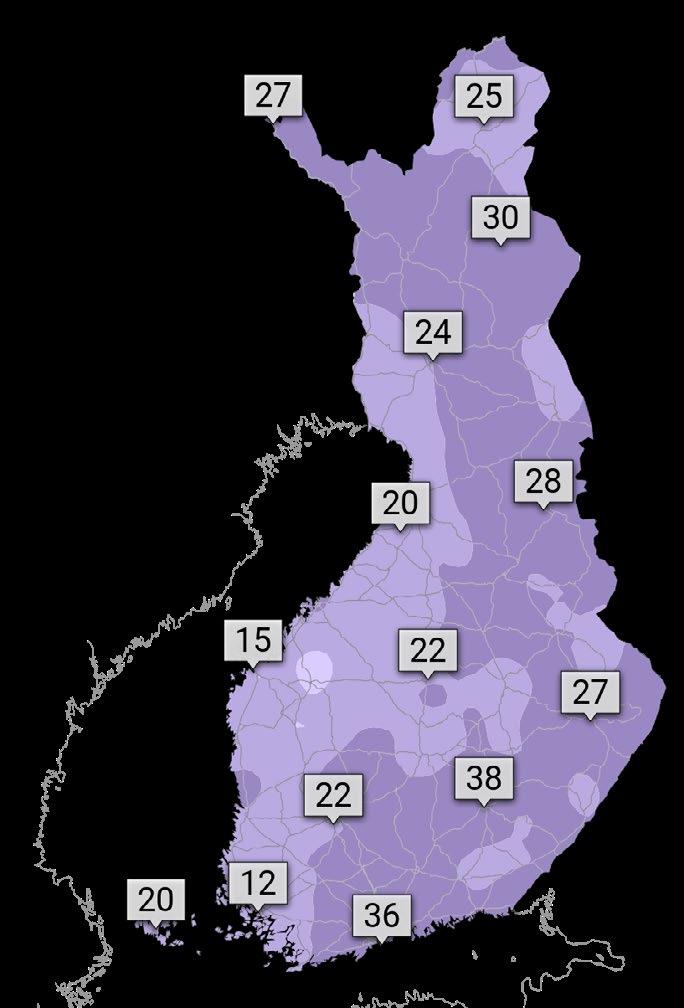 MAARIANHAMINA 27,5 TURKU 15,5 24 HELSINKI 11,2 23 JOKIOINEN 12,4 22 KOUVOLA 5,2 14 JYVÄSKYLÄ 0,4 10 SEINÄJOKI - 17 KUOPIO 3,3 OULU 3,3 ROVANIEMI 0,0 SODANKYLÄ 0,0 1 UTSJOKI 0,0 0