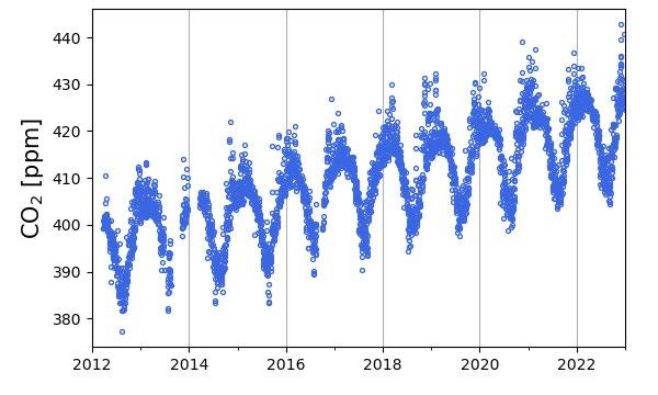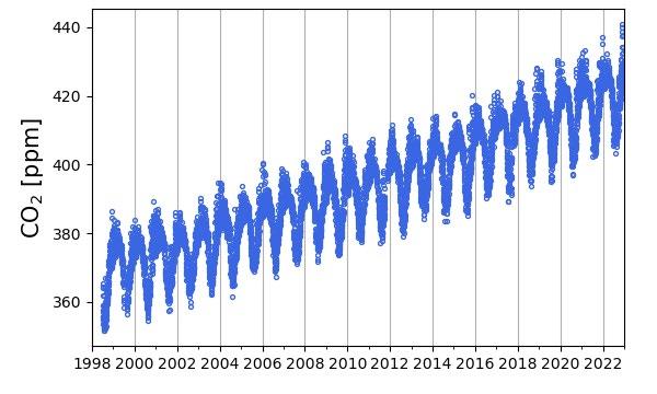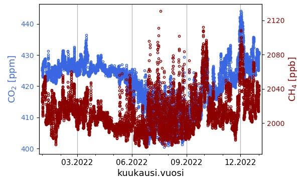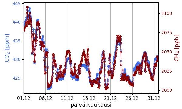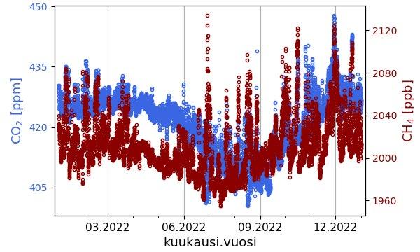 Hiilidioksidi- (CO2) ja metaani- (CH4) pitoisuuksien havaitut tuntikeskiarvot viimeisen kuukauden jaksolla (ylin rivi) sekä viimeisen vuoden jaksolla (keskimmäinen rivi) Pallas-Sammaltunturin ja Utön asemilla. Alarivin kuvissa esitetään hiilidioksidipitoisuuden kehitys useamman vuoden ajalta.