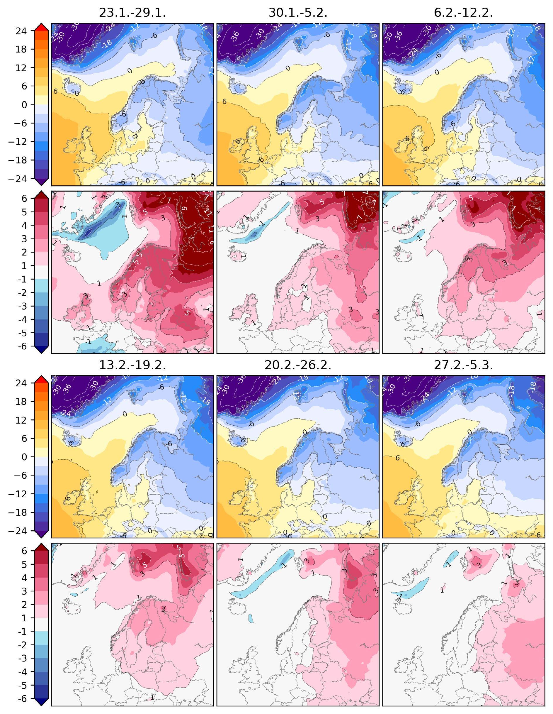 Ennustettu keskimääräinen ilman lämpötila 2 metrin korkeudella (°C) seuraavien kuuden viikon aikana (ylemmät kuvat) ja ennustetun lämpötilan poikkeama (°C) jakson 1999–2018 keskiarvosta (alemmat kuvat).