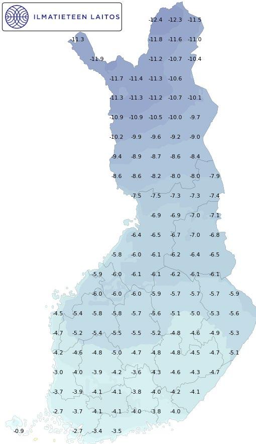 SODANKYLÄ TÄHTELÄ -10,2 -9,6 -1,2 6. -29,2 13. 66,5 41 18,9 16. 28 33 INARI SAARISELKÄ -10,8 -9,7 -2,9 1. -27,9 13. 32,2 38 5,3 26. 31 36 ENONTEKIÖ KILPISJÄRVI -11,6 -10,1 -0,4 2. -32,6 13. 23,4 49 4,8 14. 27 34 UTSJOKI KEVO -12,9 -10,6 0,1 1. -33,0 13. 38,6 28 4,9 6. 24 30