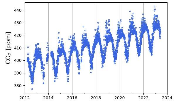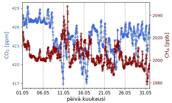 Hiilidioksidi- (CO2) ja metaani- (CH4) pitoisuuksien havaitut tuntikeskiarvot viimeisen kuukauden jaksolla (ylin rivi) sekä viimeisen vuoden jaksolla (keskimmäinen rivi) Pallas-Sammaltunturin ja Utön asemilla. Alarivin kuvissa esitetään hiilidioksidipitoisuuden kehitys useamman vuoden ajalta.