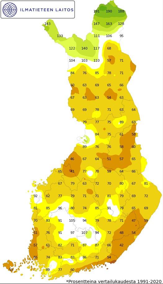 In conjunction with the low precipitation levels, the count of sunshine hours was above the average, except in northern Lapland. In the south-western archipelago the sun shone even slightly more than 400 hours.