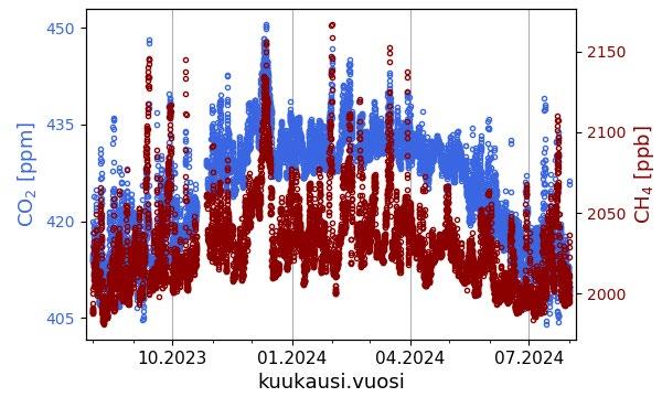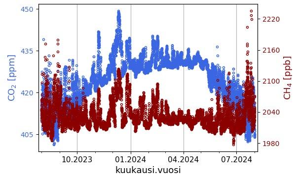Hiilidioksidi- (CO2) ja metaani- (CH4) pitoisuuksien havaitut tuntikeskiarvot viimeisen kuukauden jaksolla (ylin rivi) sekä viimeisen vuoden jaksolla (keskimmäinen rivi) Pallas-Sammaltunturin ja Utön asemilla. Alarivin kuvissa esitetään hiilidioksidipitoisuuden kehitys useamman vuoden ajalta.
