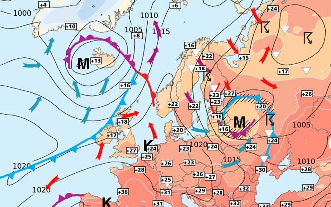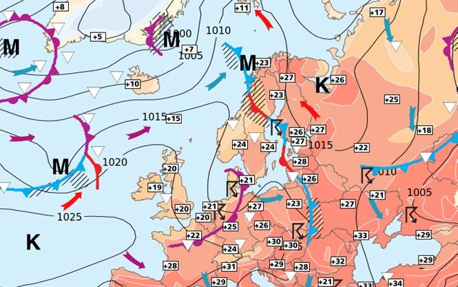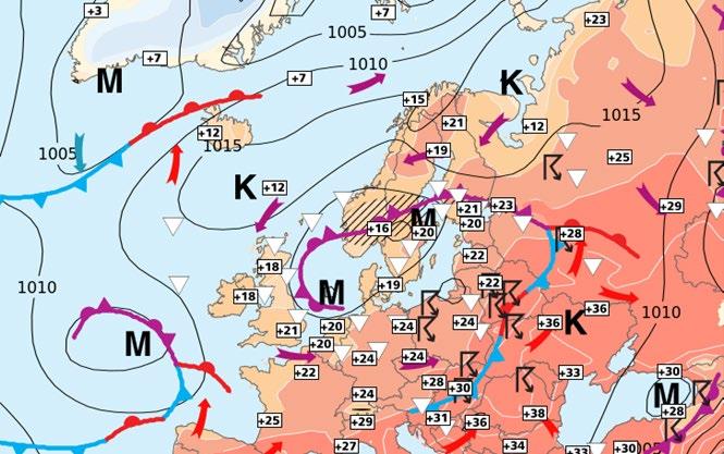 23.7. Korkeapaineen alue ulottui Novaja Zemljalta Suomen itäpuolelle, ja kaakosta virtasi maahamme lämmintä ilmaa. Suursäätilanne pysyi hyvin samankaltaisena lähes viikon ajan: Itä- ja Pohjois-Suomessa oli aurinkoista ja helteisen lämmintä, kun taas Länsi-Suomen yllä oli rintamavyöhyke, jonka yhteydessä kehittyi ukkoskuuroja.