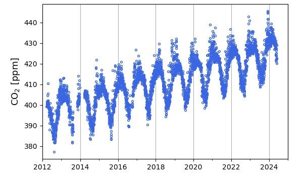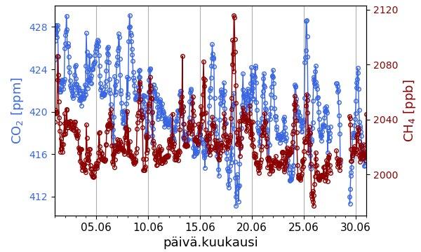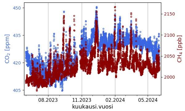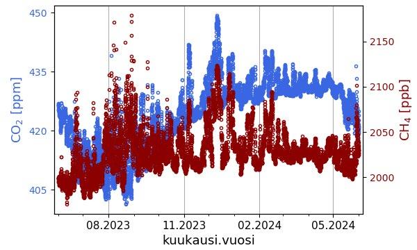 Hiilidioksidi- (CO2) ja metaani- (CH4) pitoisuuksien havaitut tuntikeskiarvot viimeisen kuukauden jaksolla (ylin rivi) sekä viimeisen vuoden jaksolla (keskimmäinen rivi) Pallas-Sammaltunturin ja Utön asemilla. Alarivin kuvissa esitetään hiilidioksidipitoisuuden kehitys useamman vuoden ajalta.