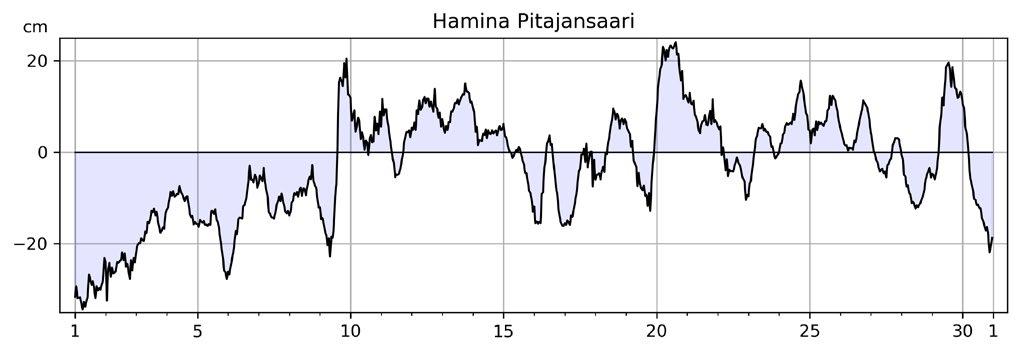 Meriveden korkeus suhteessa teoreettiseen keskivedenkorkeuteen kesäkuussa 2024. Kuvaajissa on esitetty mareografeilla tunneittain mitattu keskimääräinen vedenkorkeus.