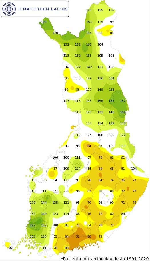 The precipitation levels were mostly above the long-term average in western and northern Finland and somewhat below the average in the south and east. The rainiest areas included the regions of Satakunta, Koillismaa and north-western Lapland. The capital region received the least rainfall. The highest level of precipitation, 135.9 mm, was measured in Tulkkila, Kokemäki and the lowest, 24.4 mm, in Kaisaniemi, Helsinki.