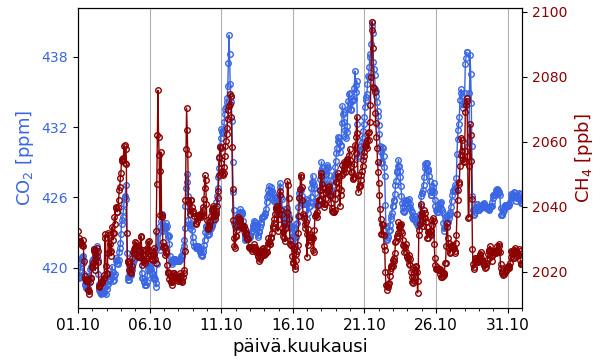 Hiilidioksidi- (CO2) ja metaani- (CH4) pitoisuuksien havaitut tuntikeskiarvot viimeisen kuukauden jaksolla (ylin rivi) sekä viimeisen vuoden jaksolla (keskimmäinen rivi) Pallas-Sammaltunturin ja Utön asemilla. Alarivin kuvissa esitetään hiilidioksidipitoisuuden kehitys useamman vuoden ajalta.