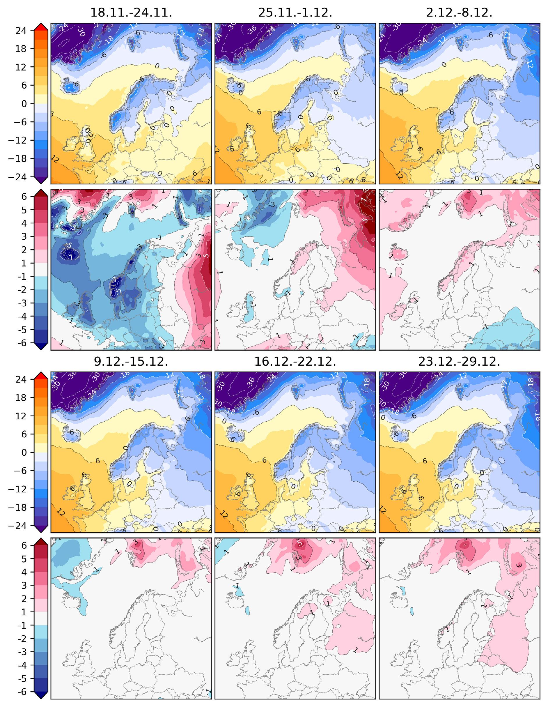Ennustettu keskimääräinen ilman lämpötila 2 metrin korkeudella (°C) seuraavien kuuden viikon aikana (ylemmät kuvat) ja ennustetun lämpötilan poikkeama (°C) edellisten 20 vuoden keskiarvosta (alemmat kuvat).