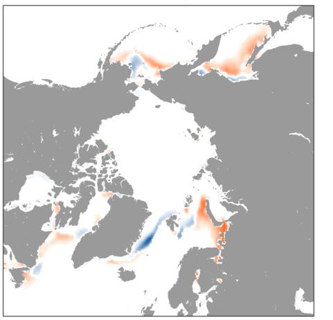 Pohjoisen jäämeren keskiosat olivat huhtikuussa edelleen kokonaan jään peitossa. Merkittävimmät poikkeamat keskimääräisestä jään määrässä havaittiin Atlantin ja Tyynenmeren sektorien reunamerillä. Jäätä oli keskimääräistä vähemmän Barentsinmeren itä- ja eteläosissa, Ohotanmerellä, osissa Beringinmerta ja vähäisemmässä määrin Kanadan itärannikolla. Sitä vastoin Grönlanninmerellä ja Huippuvuorten ympäristössä jään määrä oli laajalti keskimääräistä suurempi – mahdollisesti liittyen Barentsinmeren yllä huhtikuussa pysytelleeseen matalapaineen alueeseen ja siihen liittyneeseen merijään kulkeutumiseen kohti Grönlanninmerta. Myös pienellä alueella Beringinmerellä jäätä oli keskimääräistä enemmän.