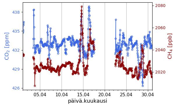 Hiilidioksidi- (CO2) ja metaani- (CH4) pitoisuuksien havaitut tuntikeskiarvot viimeisen kuukauden jaksolla (ylin rivi) sekä viimeisen vuoden jaksolla (keskimmäinen rivi) Pallas-Sammaltunturin ja Utön asemilla. Alarivin kuvissa esitetään hiilidioksidipitoisuuden kehitys useamman vuoden ajalta.