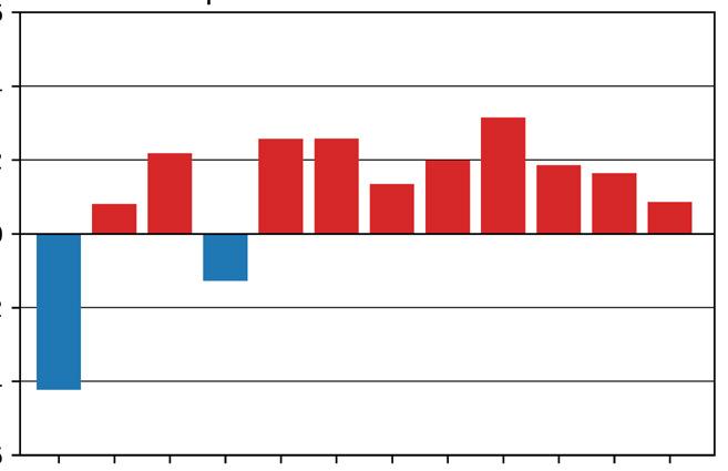 Kuva 6: Keskilämpötilan poikkeama vuonna 2024 jakson 1991–2020 keskiarvosta.