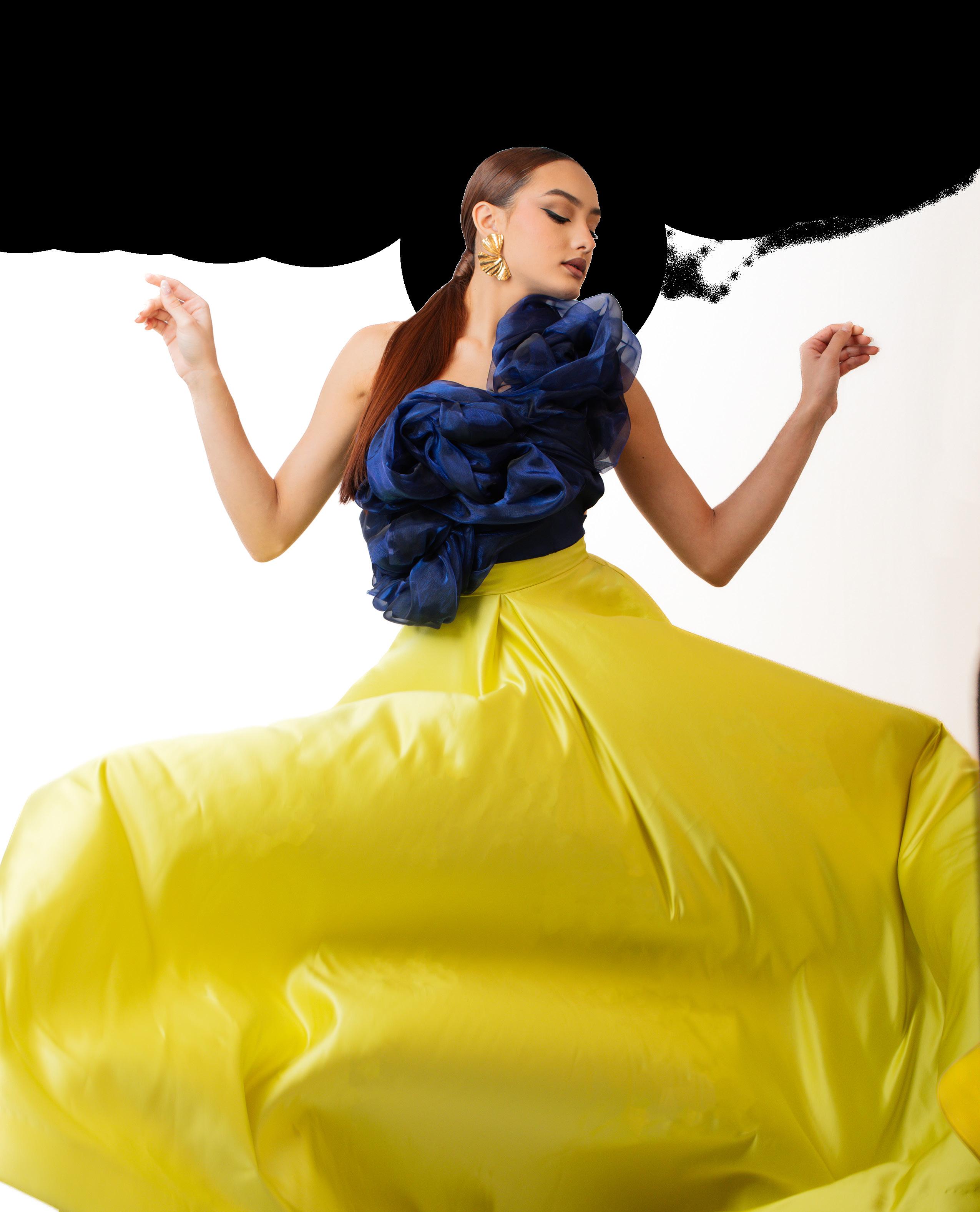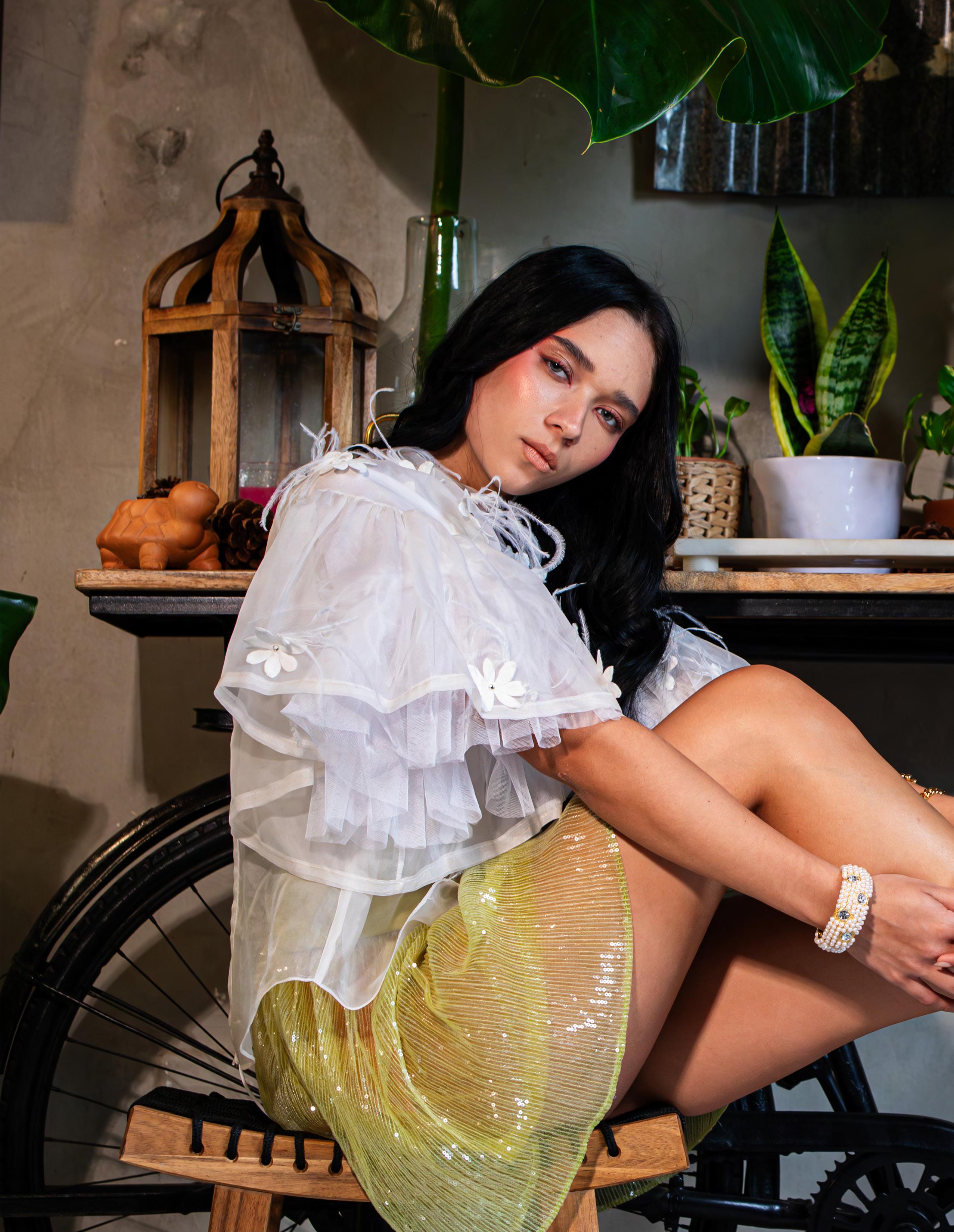Blusa, corset, falda y bañador de Edd Aponte, calzado Ego estilo Delores de Ego Shoes; brazalete cuff oro con perlas y cristales y brazaletes en cadena oro de Forever Jewelry Design.