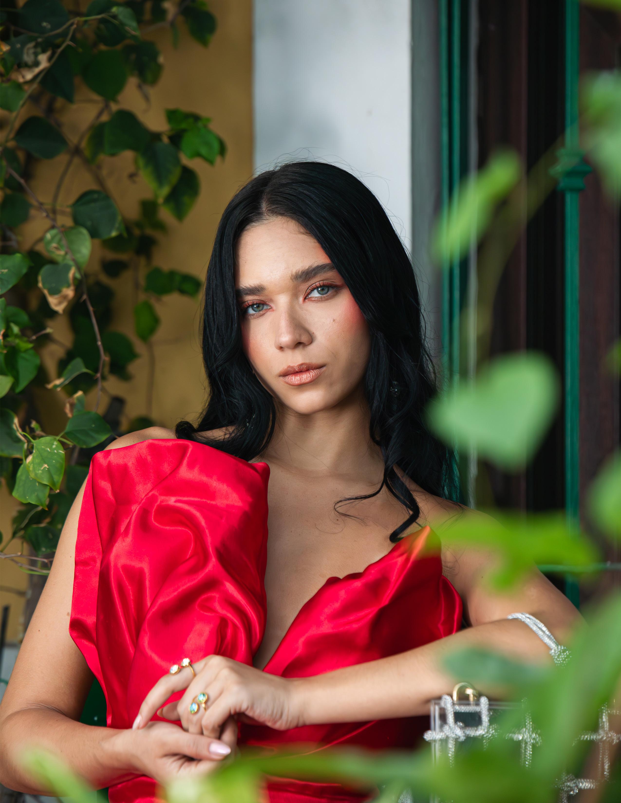 Vestido de Rahiza Alejandra, Aretes Wonder Drop color oro y anillos Monroe en color oro de Forever Jewelry Design, calzado Flux estilo Ashelle en color oro y cartera de Ego Shoes.
