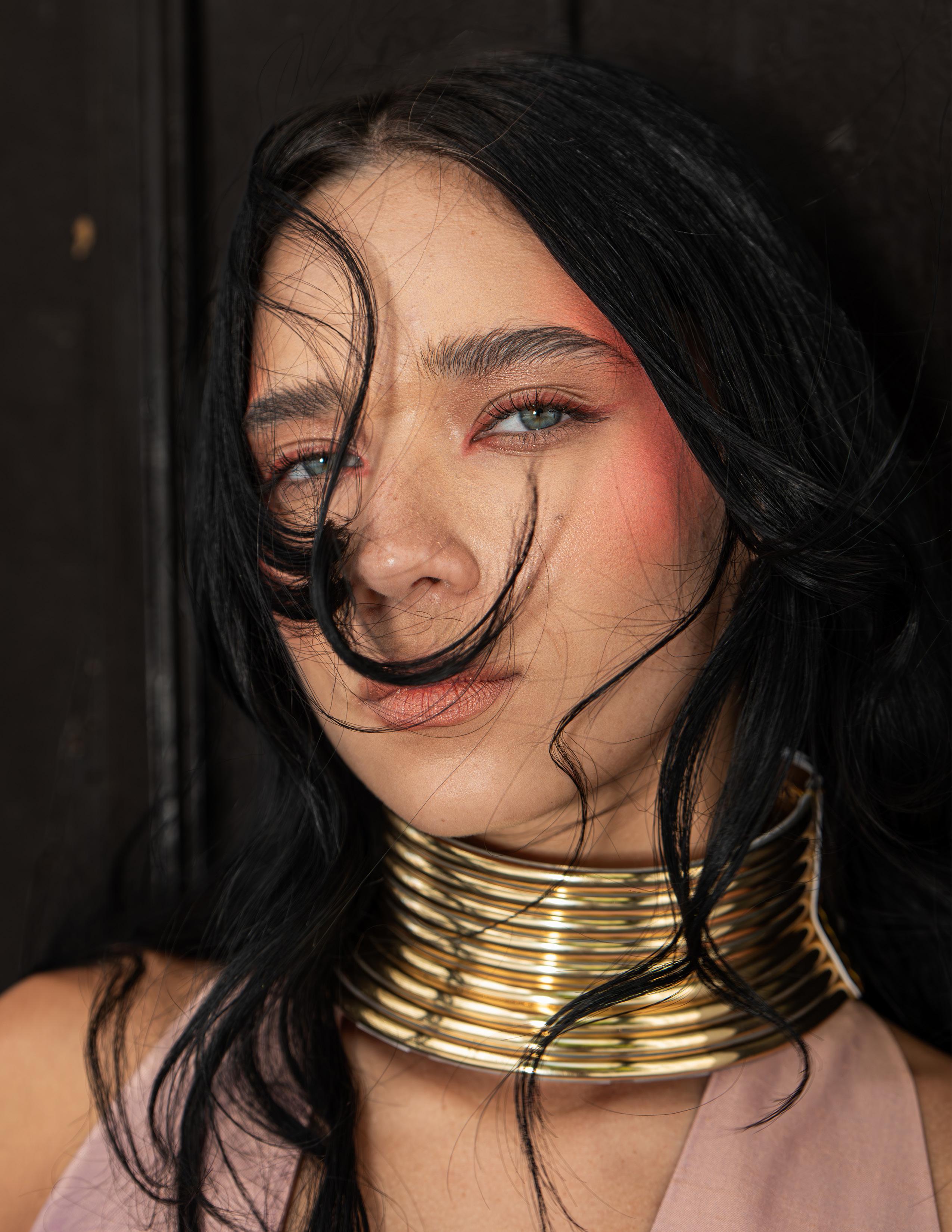 Vestido de Rubén Darío, collar Striking en color oro de Forever Jewelry Design.