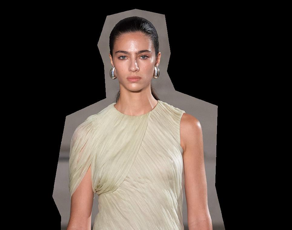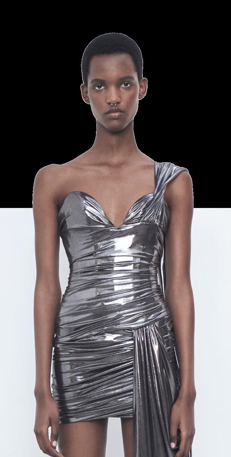Las telas metálicas siguen en su apogeo y no se detendrán pronto. Un vestido drapeado con un acabo plateado de seguro te traerá muchos halagos. Combínalo con tacones delicados en color neutral o del mismo tono metálico para crear un statement.