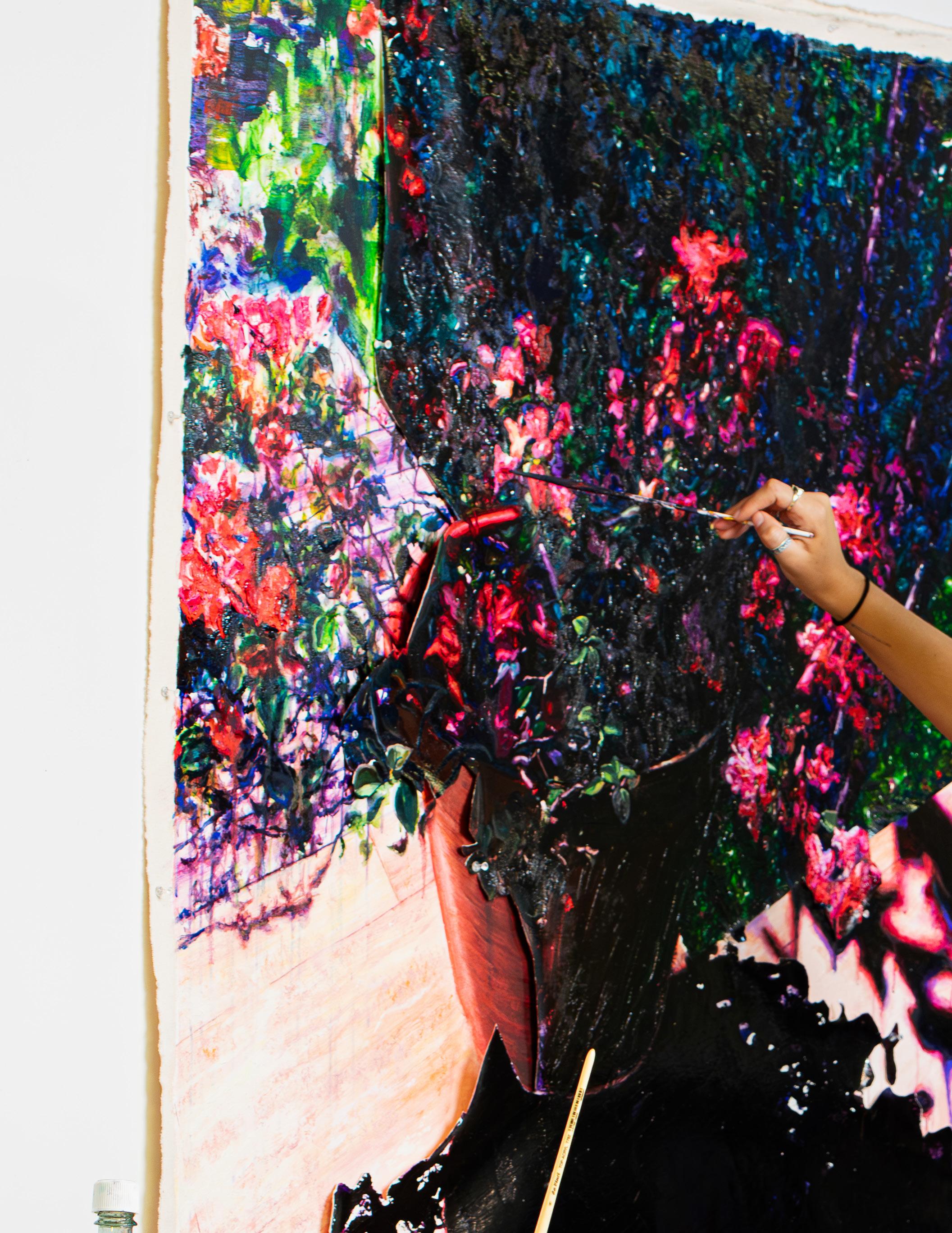 Su trabajo se inspira en los espacios naturales que la rodean en la que plasma su experiencia emocional, llenando de contrastes, texturas y colores brillantes sus obras al mismo tiempo que expone la complejidad de la condición humana. Su proceso creativo es uno muy intuitivo, el cual comienza con una fotografía que luego manipula digitalmente. Ya con la idea concretada comienza a dar pincelazos de medio mixto regularmente de acrílico y óleo en el lienzo a la pared y a jugar con las capas, los collage y costura. Con esta metodología creativa se permite fluir y reflejar su visión a plenitud.