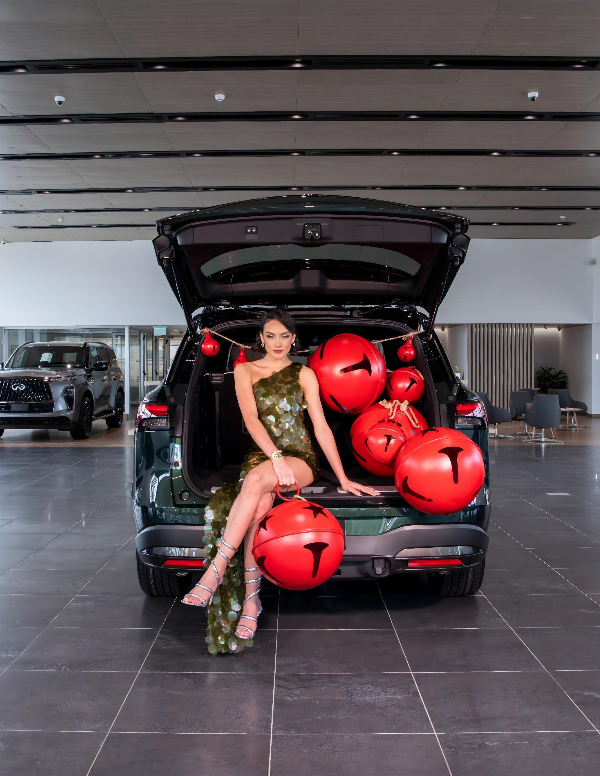Modelo QX 60 Sport de Infiniti; vestido de Jaer Cabán; calzado Berness estilo Camelia de Fabulous Shoes Inc.; pantallas y anillos de Tous.