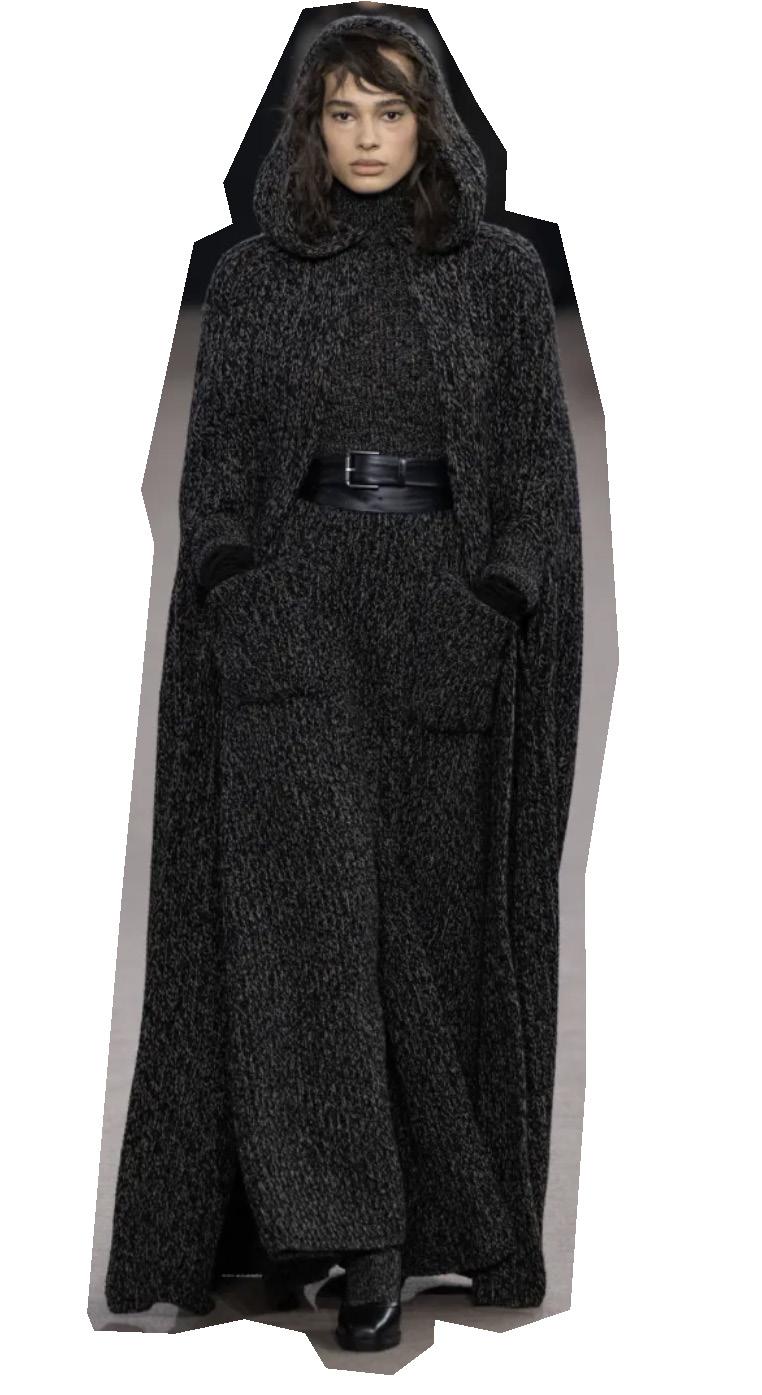 El abrigo evoluciona hacia la escultura en movimiento: capas largas, pliegues estratégicos que envuelven sin rigidez, y volúmenes modulados que evocan alas o mantos. Marcas como Calvin Klein, Brandon Maxwell, Altuzarra, Khaite, McQueen, Louis Vuitton y Max Mara sitúan esta silueta entre lo protésico y lo poético, transformando el invierno en un escenario fluido.