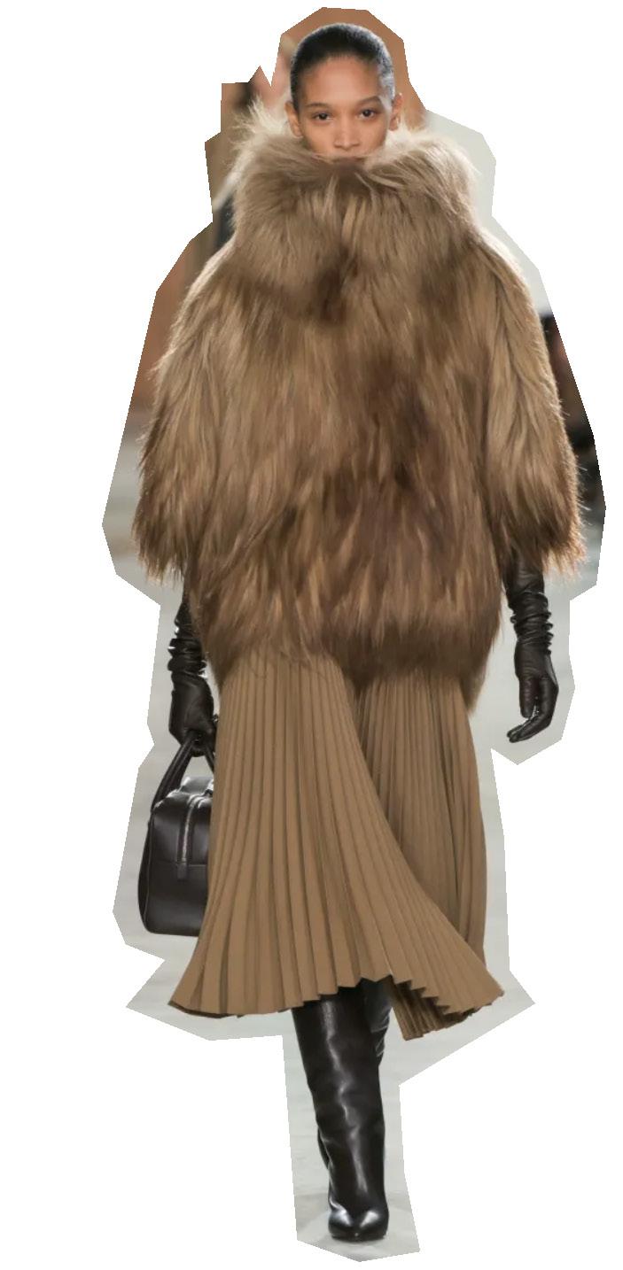El pelaje sintético se eleva a protagonista: no solo en abrigos voluminosos, sino en estolas, cuellos y mangas. Las colecciones de Michael Kors, Gucci, Prada y Simone Rocha redefinen el faux fur con texturas hiperrealistas, combinaciones de materiales y colores inesperados. El pelaje falso fue omnipresente en pasarelas globales, incluso como detalle en vestidos fluidos y siluetas estructuradas.