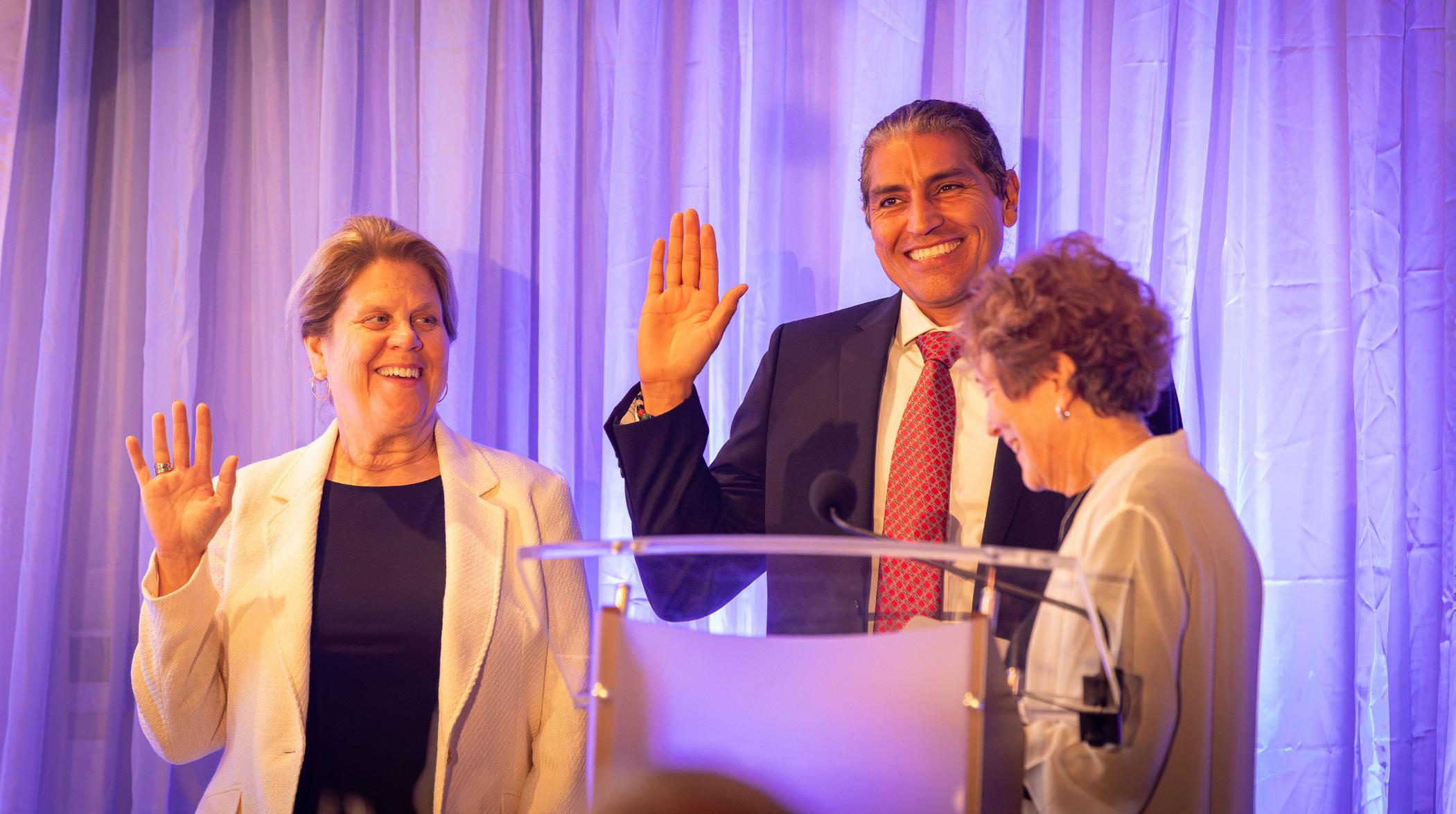 2025 President Pamela Kammen, MD, administers the oath of office to 2026 President Elect Jesus Rodriguez, MD, and 2026 Secretary-Treasurer Anne Prentice, MD.