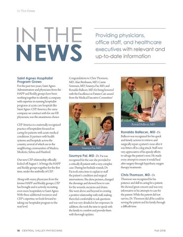 NEWS Saint Agnes Hospitalist Program Grows For the past two years, Saint Agnes Administration and physicians from the HAPP and Reddy groups have been working together to identify a company with expertise in running hospitalist programs at acute care hospitals like Saint Agnes. CEP America, the same company we contract with for our ER physicians, was the unanimous choice. CEP America is a nationally recognized practice of hospitalists focused on caring for patients with acute medical conditions. It partners with health systems and hospitals across the country, several of which are in the neighboring communities of Madera, Modesto, Selma and Hanford. Our new CEP relationship officially kicked off August 1. It brings the HAPP and Reddy groups together for the first time, under the umbrella of CEP. Along with many physicians from the former HAPP and Reddy groups, CEP has brought and is actively recruiting even more hospitalists to Saint Agnes. With these additional resources and CEP’s expertise, we look forward to taking our hospitalist program to the next level.