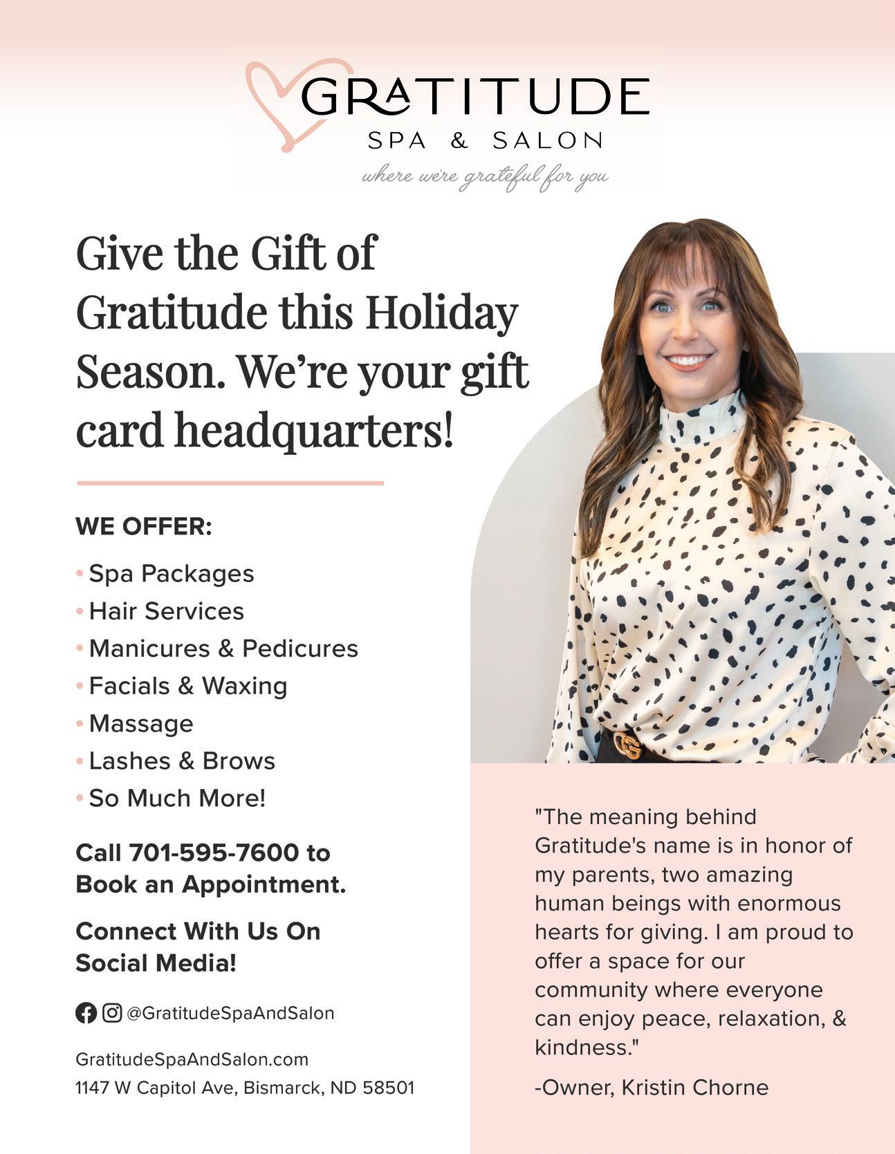 Bis-Man INC! is published 4 times a year and is available at area businesses and online at Bismaninc.com. Bis-Man INC! is published by Spotlight LLC, Copyright 2022 Bis-Man INC! & BismanInc.com. All rights reserved. No parts of this magazine may be reproduced or distributed without written permission of Bis-Man INC!, and Spotlight LLC, is not responsible for, and expressly disclaims all liability for, damages of any kind arising out of use, reference to or reliance on such information. Spotlight LLC, accepts no liability for the accuracy of statements made by the advertisers. WINTER 2022 Volume 1 Issue 4 Publisher EDITORIAL Editorial Team Lead Editors Art Director Editorial Graphic Designers Creative Strategist Contributors INTERACTIVE Business Development Manager Business Development Associate Videographer Director of Digital Advertising Results Graphic Designer Web Designer ADVERTISING VP of Business Development Sales Representatives Sales & Marketing Advisor Marketing Associate Client Relations Client Relations Manager Marketing Coordinator DISTRIBUTION Delivery Mike Dragosavich Brady Drake Brady@SpotlightMediaFargo.com Geneva Nodland, Grant Ayers Kim Cowles Levi Dinh, Ty Betts Josiah Kopp Ladyboss Lifestyle, Wendy Klug Nick Schommer Kellen Feeney Tommy Uhlir Jonathan Chicka Ben Buchanan Kellan Benson Paul Hoefer Paul@SpotlightMediaFargo.com Al Anderson Al@SpotlightMediaFargo.com Devan Maki Devan@SpotlightMediaFargo.com Tori Helland Tori@SpotlightMediaFargo.com Kacey Mongeon Kacey@SpotlightMediaFargo.com Hailey Bebler Hailey@SpotlightMediaFargo.com ClientRelations@SpotlightMediaFargo.com Jenny Johnson Jessica Mullen John Stuber Spotlight, LLC 4609 33rd Ave S Suite #304 Fargo, ND 58104 or info@spotlightmediafargo.com ADVERTISING: 701-478-SPOT (7768) From Development, Construction & Property Management, to Commercial & Residential Real Estate, Roers is a True Full-Service Firm. Roers.Com | 701.751.7400 1519 Continental Ave Bismarck, ND 58504 Building Success & Stronger COMMUNITIES Missouri Slope Lutheran Care Center, Bismarck Recent Project