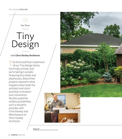 he third and final installment of our Tiny Design Series has finally arrived, and we're taking it outside. Featuring tiny sheds and playhouses, these three projects represent what happens when both the architect and client prioritize innovation over convention. We discussed the endless possibilities such a situation provides with Chris Hawley and Mike Dawson of Chris Hawley Architects. BY Becca Opp PHOTOS BY Chris Hawley Architects and Hillary Ehlen