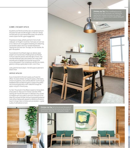 LOBBY AND KID’S SPACE As patients and friends or family wait, we wanted to ensure the space had color and life brought in, which isn’t always the focal point of a commercial office space. We wanted to create a space that left a great engagement! Proposing two dogs, perfectly perched in front of wild wallpaper, we thought it would be a hard pass, but luck was on our side and, oh, it’s so good! Interesting and welcoming conversation pieces. One of our favorite experiences? Hearing over and over how “the dogs” are a fan favorite. We get it! #puppylove To complement the off-leash dogs is an abstract piece of green and neutral tones. A floating frame and flanked furniture make this abstract piece feel right at home. Two nine-foot fiddle leaf trees were ordered with matte, black concrete pots to highlight the industrial nature of the surrounding spaces. If you’re looking to add life into a space, greenery is always a great place to start – even if faux. Lastly, grab the record player – the kid’s space is adorned in playful vinyls. OFFICE SPACES As you’re escorted to the exam spaces, you’ll pass the offices. To create cohesion among the spaces, white books, artwork and greenery were carefully selected. Continuing an established look and feel throughout a space is the perfect way to ensure guests feel a warm welcome through the space – not just in the entryway. Fun fact: The artwork in the offices is based on the locations of education Dr. West and Dr. Emerson attended. While working with the WE Ortho team on selections they wanted to integrate work that pulled in some sort of tie back to the cities and we loved the idea. We love incorporating personal nods without being overly apparent or literal so we were on board! It brings it back to interest and conversation – a great quality of well-selected artwork. Christen Joy Tip: We’ve found over the years of installing artwork that 60 inches to the center of the artwork, off the floor, is the perfect height.