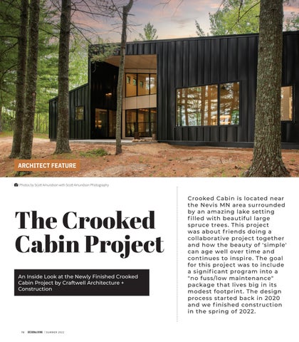 Crooked Cabin is located near the Nevis MN area surrounded by an amazing lake setting f illed with beautiful large spruce trees. This project was about f riends doing a collaborative project together and how the beauty of 'simple' can age well over time and continues to inspire. The goal for this project was to include a signif icant program into a "no fuss/low maintenance" package that lives big in its modest footprint. The design process started back in 2020 and we f inished construction in the spring of 2022.