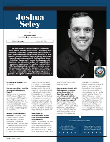 First job after service: Diesel Technician Did you use military benefits when starting Deckplate Diesel? Yes, I am currently enrolled in NDSU’s Masters of Business Administration (MBA) program. The G.I. Bill has allowed me to learn about business, while I run my business Deckplate Diesel. I am very thankful for the veteran resources available through the VA and NDSU.