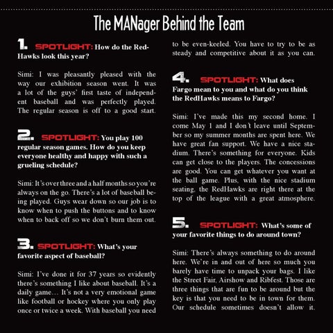 Spotlight: How do the RedHawks look this year? Simi: I was pleasantly pleased with the way our exhibition season went. It was a lot of the guys’ first taste of independent baseball and was perfectly played. The regular season is off to a good start.