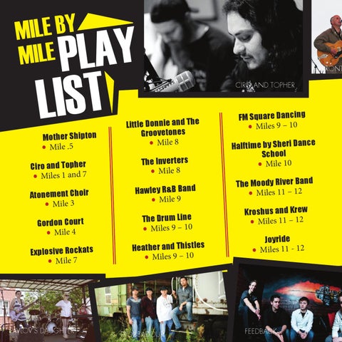 Little Donnie and The Groovetones • Mile 8 The Inverters • Mile 8 Hawley R&B Band • Mile 9 The Drum Line • Miles 9 – 10 Heather and Thistles • Miles 9 – 10