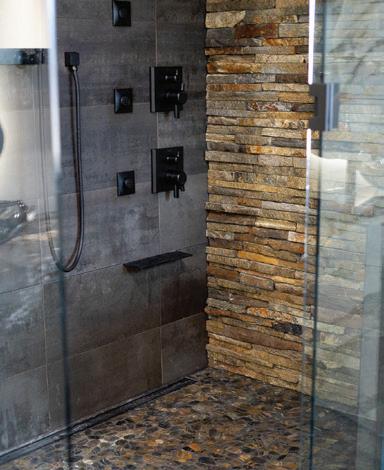 Stepping into the bathroom, you can see how the rock wall influenced things like the show tiling, which shows off a variety of tones and color variations. Roxanne says the secret sauce is in layering different products with different tones to help capture the overall essence they're trying to achieve. "It was so much fun and also eye-opening because now I'm in love with moody masculine design," she said.