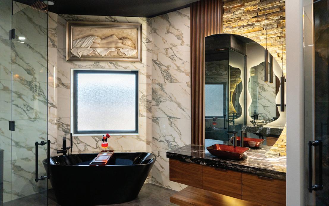 As art collectors, the artwork above the bathtub was one of the many pieces the homeowners had displayed in their home, and Roxanne and her team found the perfect spot for this one, which complemented the marble wall perfectly while adding a unique element.