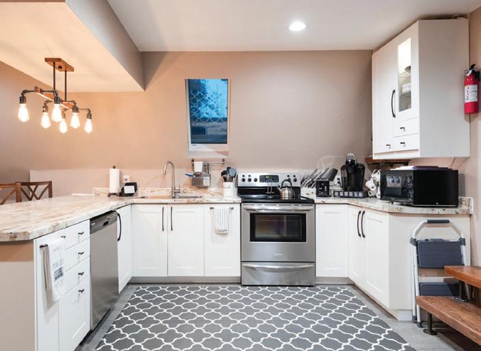 Back down on the main level, the living room offers plenty of comfortable seating with a large smart TV for cozy nights in. Past the staircase, guests have access to a full kitchen, complete with a stove/oven, microwave, and fridge for all of your cooking and food storage needs.