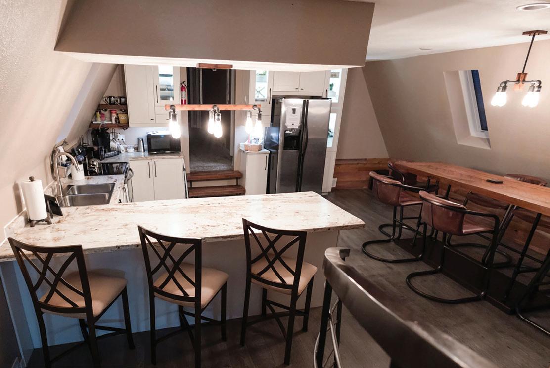 Granite countertop seating as well as a butcherblock-style high-top dining table offers plenty of seating for mealtimes and game nights.