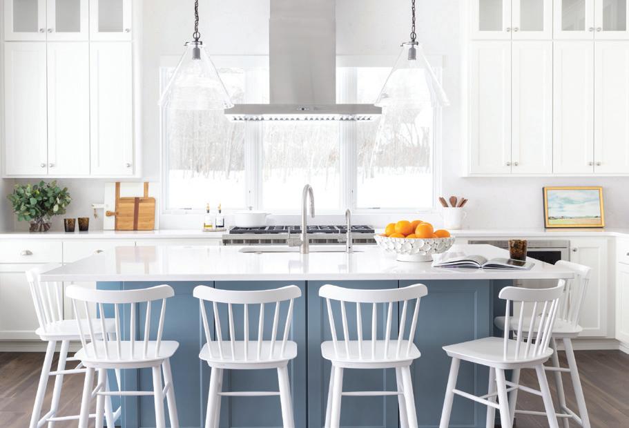 "The kitchen offers a fresh, airy feel with its pristine white cabinets and soft blue island, which color coordinates with a bar space to the right (not pictured in this article). This palette brings balance and depth to the room."