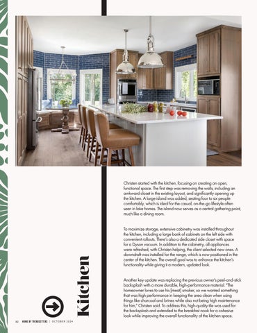 To maximize storage, extensive cabinetry was installed throughout the kitchen, including a large bank of cabinets on the left side with convenient rollouts. There’s also a dedicated side closet with space for a Dyson vacuum. In addition to the cabinetry, all appliances were refreshed, with Christen helping, the client selected new ones. A downdraft was installed for the range, which is now positioned in the center of the kitchen. The overall goal was to enhance the kitchen’s functionality while giving it a modern, updated look. Another key update was replacing the previous owner's peel-and-stick backsplash with a more durable, high-performance material. "The homeowner loves to use his [meat] smoker, so we wanted something that was high performance in keeping the area clean when using things like charcoal and brines while also not being high maintenance for him," Christen said. To address this, high-quality tile was used for the backsplash and extended to the breakfast nook for a cohesive look while improving the overall functionality of the kitchen space.