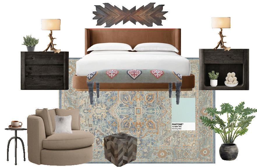 "The Rustic Cabin theme was a challenge for me, which I loved! I typically don't think of the Pantone color 'Morning Mist' as being part of something rustic. The rug was my secret weapon in bringing in that color. Overall, I liked working on this theme; I am currently working on a new rustic construction home so I have that on my brain right now. I enjoy creating something warm and enveloping—even on the screen, I feel this mood board looks like 'home.'"