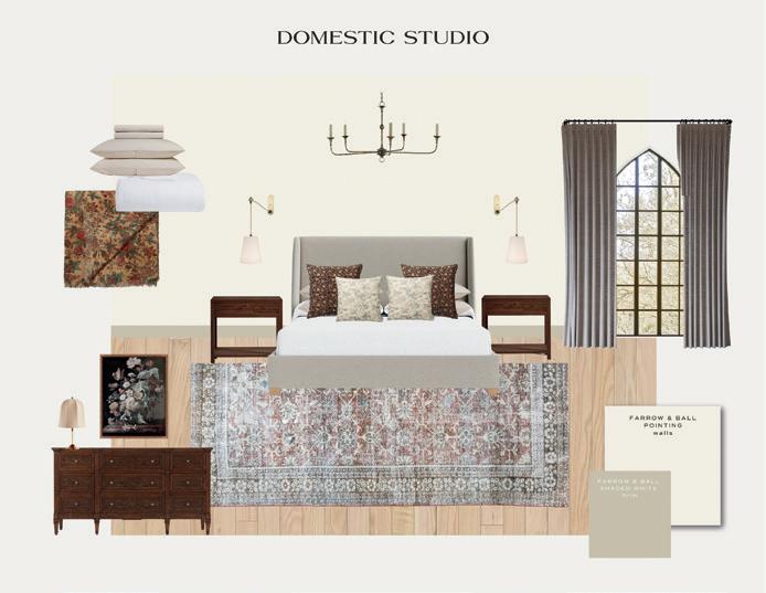 "For the bedroom, I wanted to change it up a bit, so I designed a more tranquil space. In a real home, you wouldn’t want every space to feel too moody or hit the same note. Again the focus is on the beautiful pointed window. The chandelier, dresser, and art are Gothic-inspired. When you think of Victorian style, florals are also a common element so I leaned into that with the textiles. I focused on mixing textures and patterns for a layered look. The bedroom feels congruent with the rest of the home, but a bit more restful."
