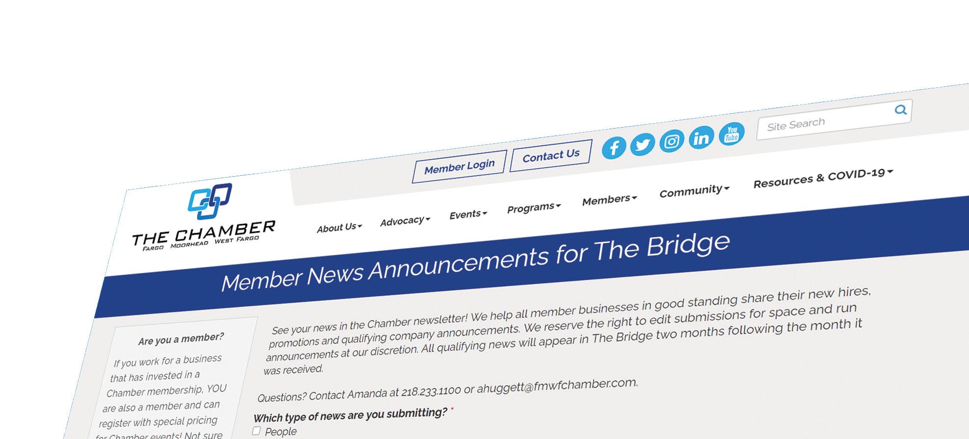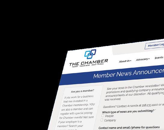 THE BRIDGE (USPS 124-430) is published monthly by the Fargo Moorhead West Fargo Chamber. For each issue received, $3.50 of membership dues are applied toward subscription of the newsletter. Periodicals Postage Paid at Fargo, ND 58102 and at additional mailing offices. Publication No. 124430. POSTMASTER: Send address changes to The Bridge, PO Box 2443, Fargo, ND 58108-2443; 218.233.1100. Printed by Forum Communications Printing